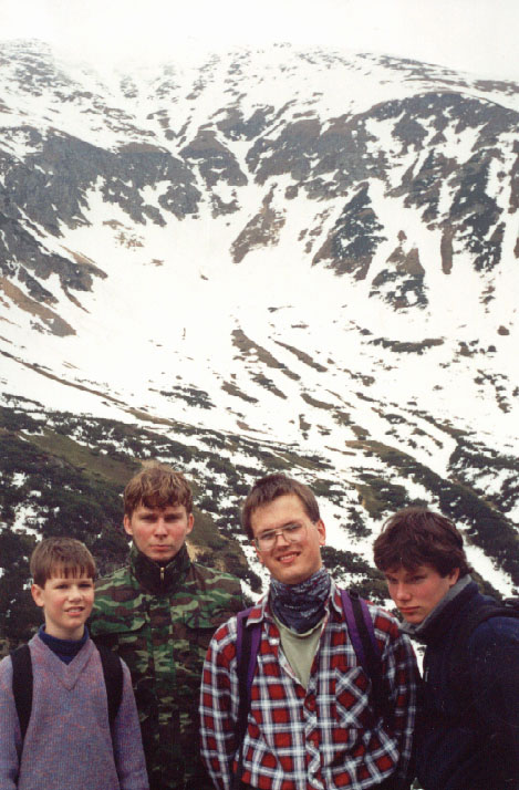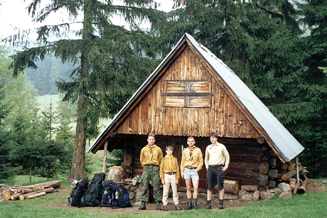 Tož to jsme u kolibky na Laništi. Torr, Vrabčák, Simba, Tichošlápek. Tak nějak jsme vypadali při příjezdu a odjezdu. Jináč jsme chodili odění turisticky. Jak vidno, batohy máme velké, kolibka je malá ... ale zato útulná. Spravuje to tady člen horské služby, horár pan Josef Repa. Mail má sice strašný, ale je to úplně bezvadný člověk. Takže kdyby jste také chtěli spát s medvědy, tak pište abulafia@centrum.sk Josef Repa Hradišská 626/3 031 04 Liptovský Mikuláš Slovensko |