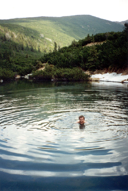 Scházíme na východ po červené značce, dost těžkým sešupem, a pokračujeme hustou klečí po hřebeni až k Josefově tajné zkratce, která se promotává houštím strmě dolů a končí u Bílého Bobroveckého plesa. Vytahuju vařič a kuchtím supersilnou zeleninovou polévku. Ostatní zatím studují veliké fleky na hladině plesa, složené z tisíců malinkých mušek, a testují teplotu vody. Josef nabízí dvě stě a posléze čtyři sta korun slovenských tomu, kdo vydrží čtyři minuty po krk ve vodě. Pokouší se o to Prófa, Torr a já. Rekordu dosahuje Prófa – 32 sekund. Torr se odchází otužovat po sněhem zavátém břehu na blízkou skalku a pak dlouho povykuje a požaduje přinesení obuvi, neboť sníh je studený, promrzlý, ostrý a vůbec. Nakonec dohopsá zpět bos a o sníh přestává jevit zájem.