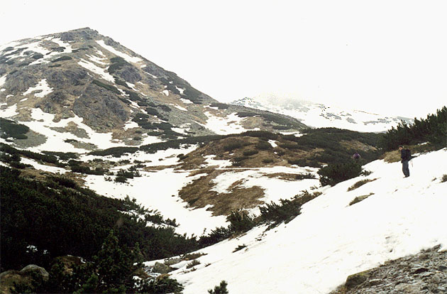 | Sedlo Predůvratie, v pozadí je vidět vápencový Sivý vrch, a za náma nejsou vidět Babky. Hřeben Sivý - Babky jsme si oblíbili a každý rok si vyšlápneme až nahóru. I počasí nás má rádo, jen bouřka nás v roce 2003 zahnala k Bobroveckým plesům a trošku zasněžilo. |