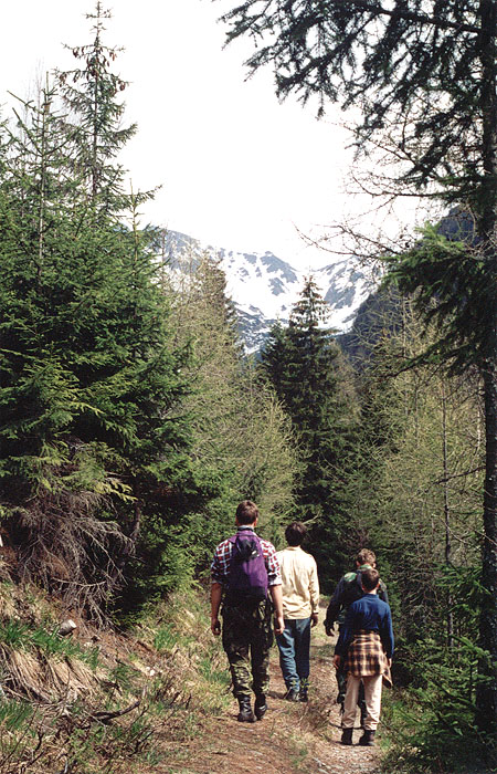 | Jsme v Žiarské dolině, asi tak na půl cesty k chatě a samozřejmě jdeme po staré značce. Přece si nebudeme ošoupávat nohy na asfaltě. Za náma Baraniec, nepřístupný a značně nervózní. A takový zůstal i v den výstupu. Asi nám moc nevěřil, napoprvé. |